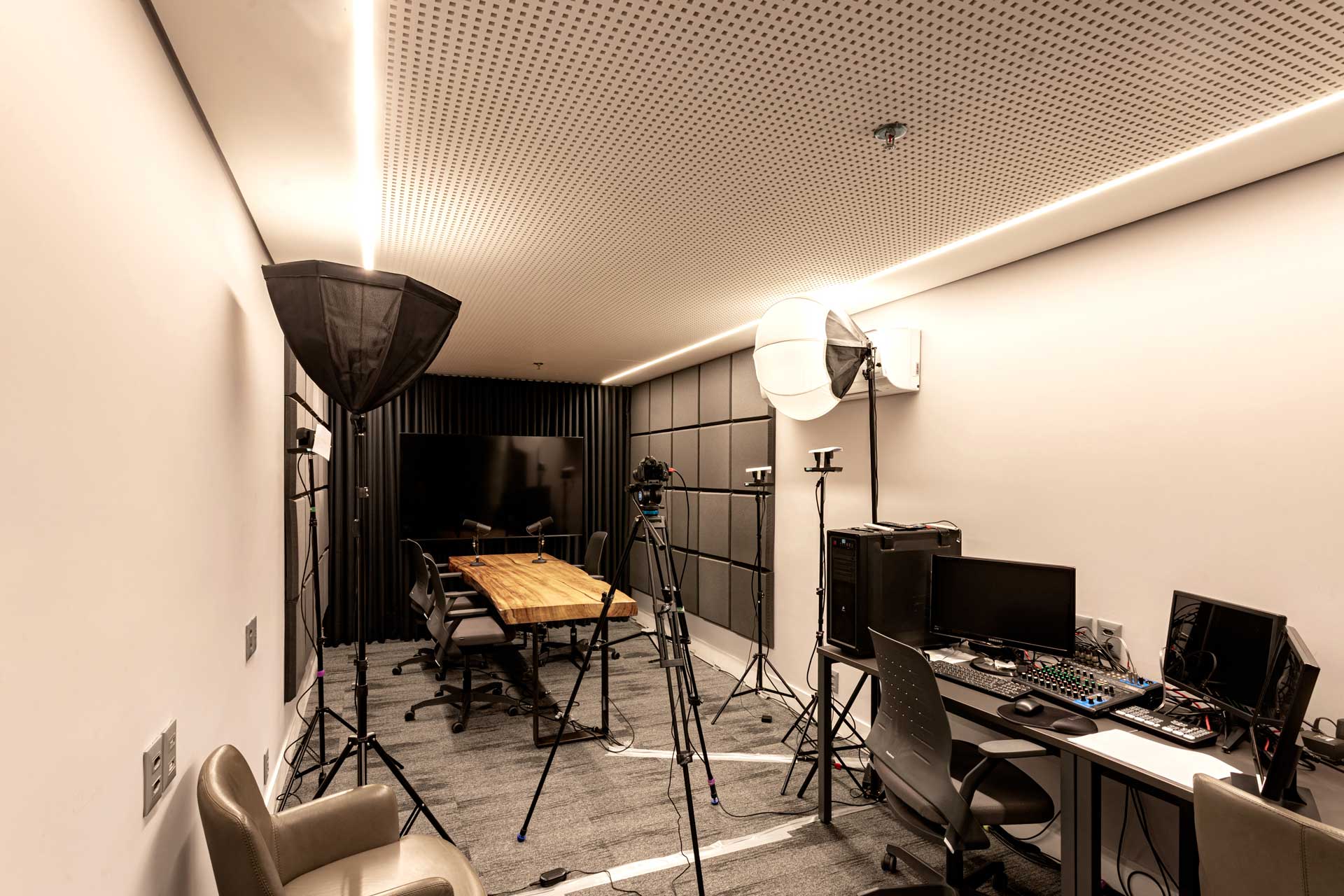 A sala multimídia Legalità é um espaço equipado com recursos de última geração de áudio e vídeo para a produção de conteúdos. Inclui equipamentos como microfones SHURE, fones de ouvido, 4 câmeras (Canon e EOS Rebel), canhão de luz com softbox, ilha de edição e acústica tratada para garantir gravações de alta qualidade.
